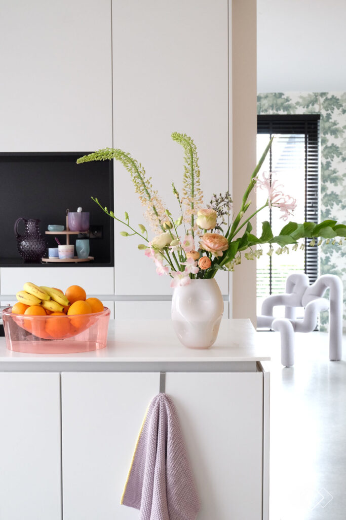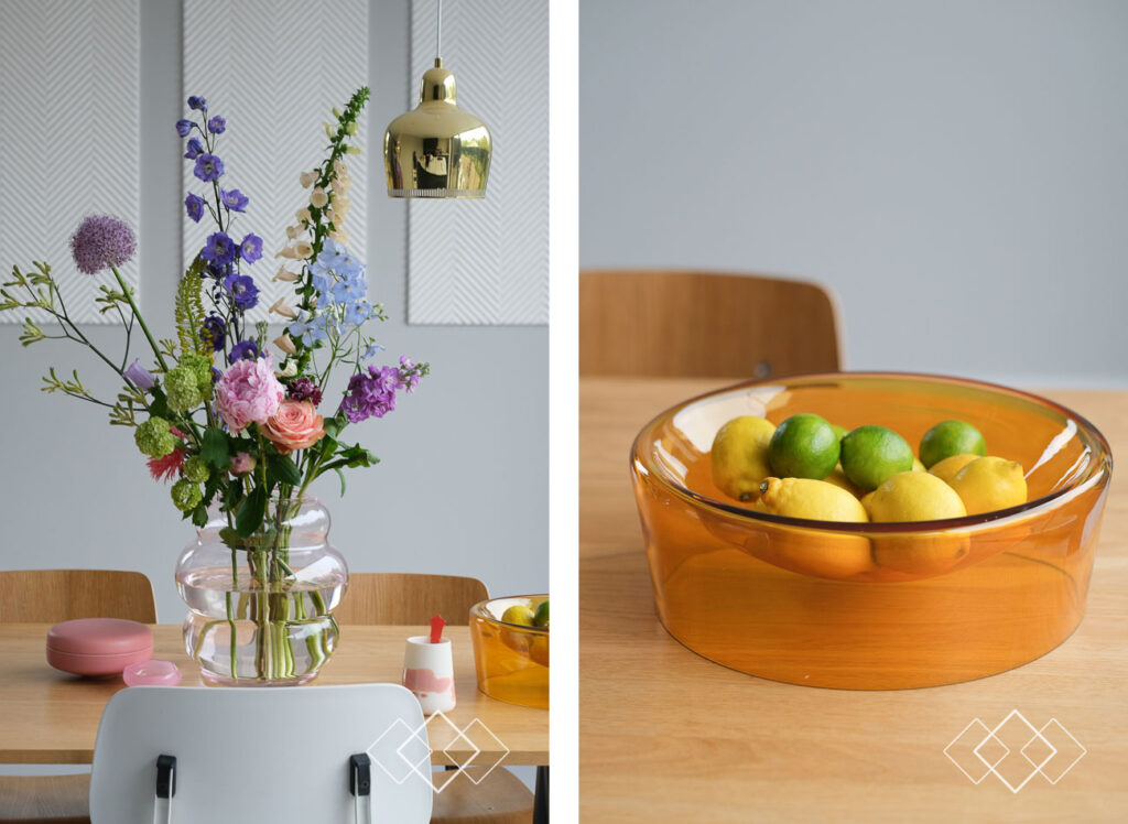 Deze geweldige glazen fruitschaal is inmiddels al jaren in ons bezit en heeft nog nooit een kast van binnen gezien: elke vrijdag wordt hij weer gevuld met fruit van de markt. Door zijn formaat en kleur wordt hij onderdeel van je interieur, het zal je dan ook niet verbazen dat we hem – naast de Lloyd tafel – vaak opnemen in onze stylingadviezen. Hij geeft je aanrecht of eettafel in een handomdraai een flinke toef kleur – uiteraard is de roze favoriet – en hij biedt lekker veel ruimte aan jouw verse fruit of groentes. En nee, zoveel citroenen en limoenen hebben we normaal gesproken niet zomaar op voorraad, maar wel als er taarten gebakken gaan worden.