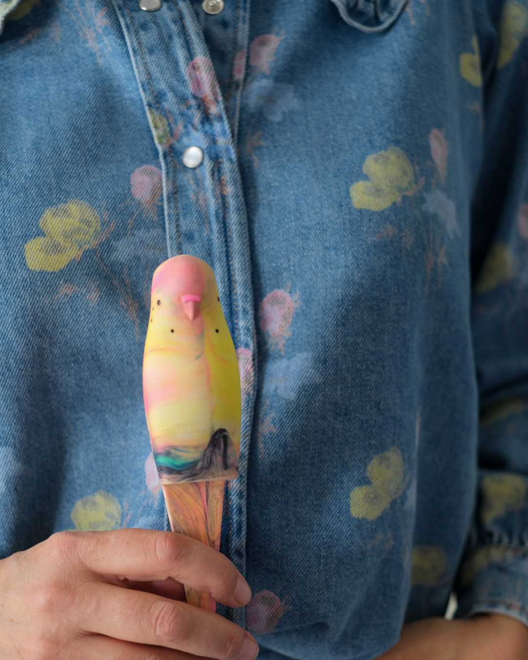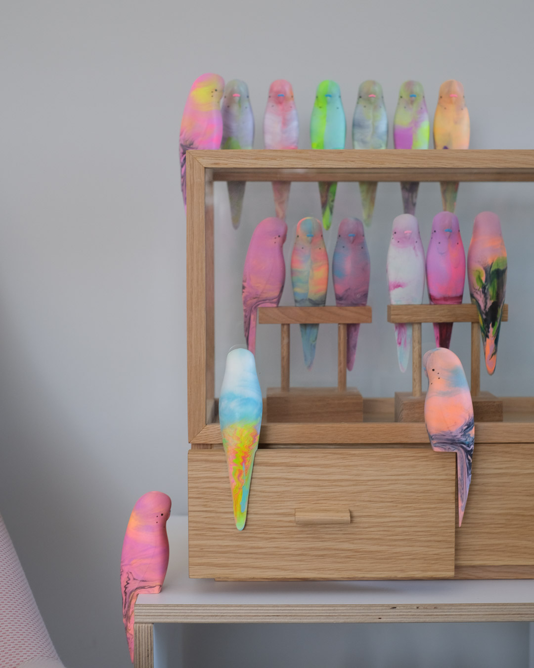 We hebben er inmiddels honderden in onze handen gehad. Je kunt het je bijna niet voorstellen, maar ze hebben allemaal hun eigen unieke kleuren en tekening. We hebben ons er nog weleens aan gewaagd om duo’s te maken, noemden onszelf een parkieten datingbureau en hadden daar erg veel lol in. Sommige parkieten worden namelijk nóg mooier naast een andere. Het grotere standaardje was natuurlijk meteen een succes. Daar passen tenminste lekker veel vogeltjes op. Ook zagen we bij jullie heel veel originele oplossingen voorbijkomen: parkietjes op schilderijlijsten, in kasten en op etageres. Overal blijven ze hun plekje vinden in jullie huizen.