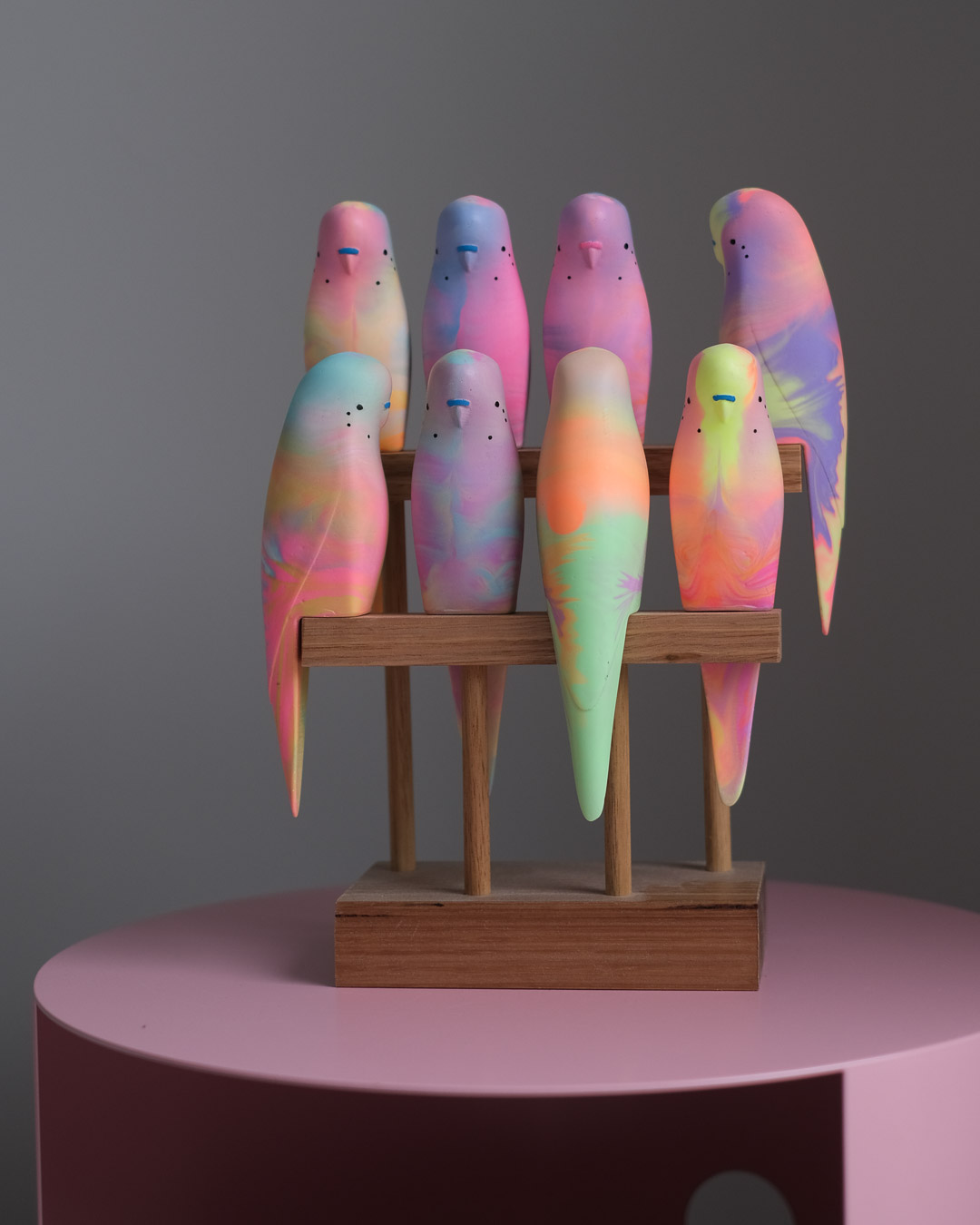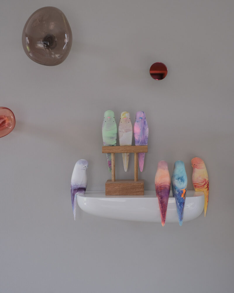 We hebben er inmiddels honderden in onze handen gehad. Je kunt het je bijna niet voorstellen, maar ze hebben allemaal hun eigen unieke kleuren en tekening. We hebben ons er nog weleens aan gewaagd om duo’s te maken, noemden onszelf een parkieten datingbureau en hadden daar erg veel lol in. Sommige parkieten worden namelijk nóg mooier naast een andere. Het grotere standaardje was natuurlijk meteen een succes. Daar passen tenminste lekker veel vogeltjes op. Ook zagen we bij jullie heel veel originele oplossingen voorbijkomen: parkietjes op schilderijlijsten, in kasten en op etageres. Overal blijven ze hun plekje vinden in jullie huizen.