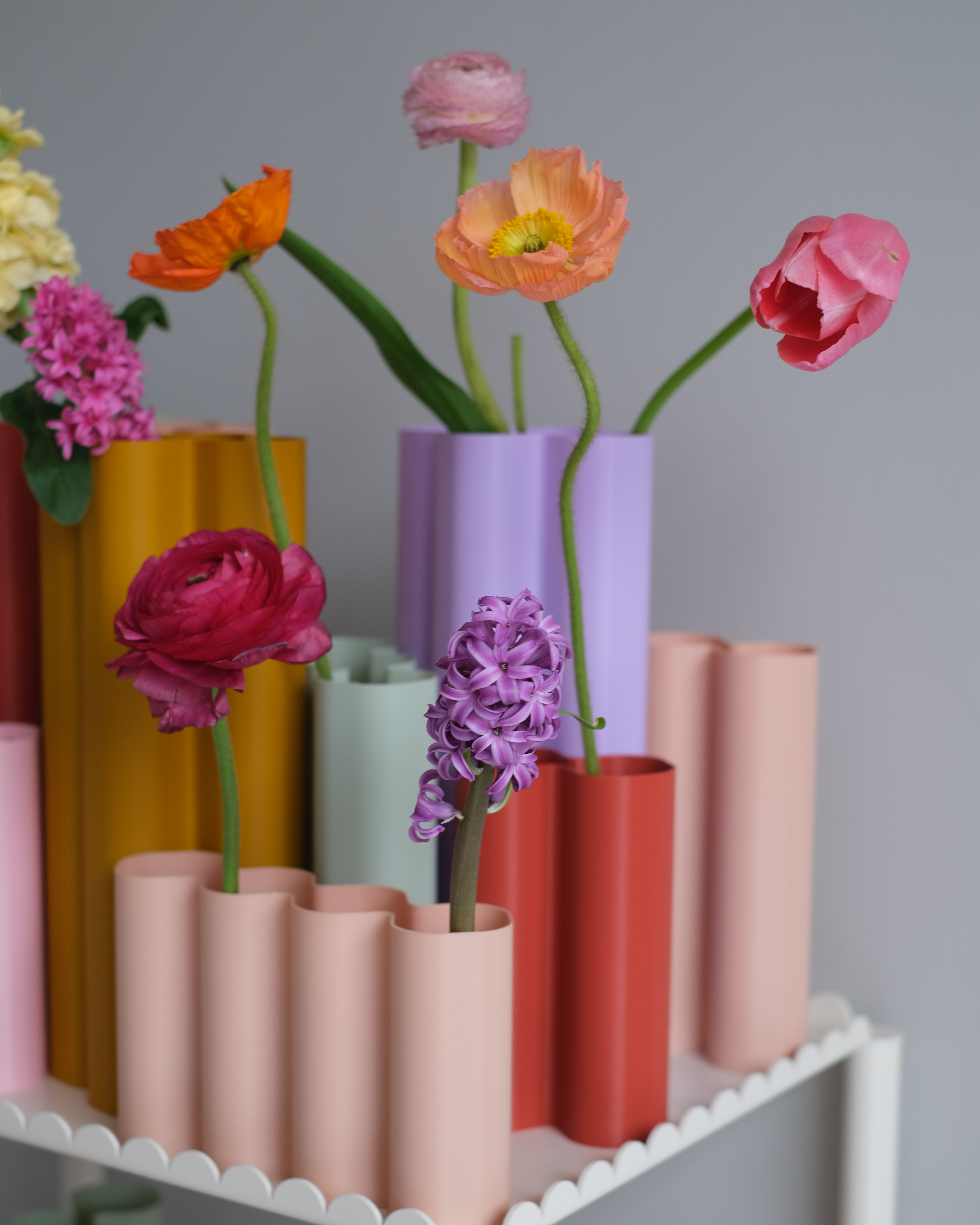 Een ontzettend groot voordeel is dat deze vaas in zoveel verschillende maten bestaat. Want zeg nou zelf: ‘less is more’ geldt echt niet voor de Alvaro. De S is het kleinste type. Met twee buisjes naast elkaar leent deze variant zich perfect voor wat geplukte voorjaarsbloeiers uit de tuin, of voor wat korter geknipte bloemen uit een boeket van vorige week. De M bestaat uit vier lagere buizen naast elkaar. Wij zien hem al helemaal voor ons met schattige tulpjes, kleine narcisjes of misschien wel ranonkeltjes. De L is wat hoger en is opgebouwd uit drie verticale buisjes en de XL is de ster van de show. Lekker hoog, met vier buizen in de vorm van een kruis tegen elkaar aan. Zelfs bloesemtakken of lange Franse tulpen voelen zich hierin thuis.